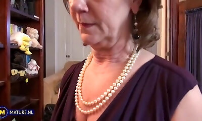 Insatiable, blonde grandmother is playing with her tits and her lovers manmeat, in the kitchen