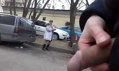 Flashing his cock to mature lady