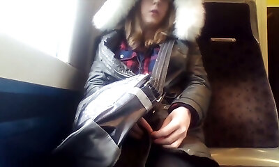 Depraved shemale enjoys to display her private parts on public transportation