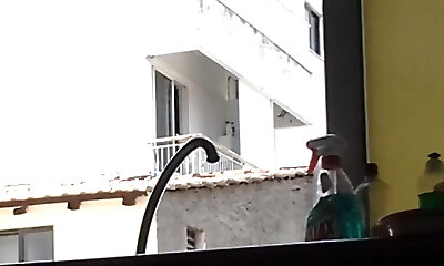 MILF in bathrobe without panties and bra washes window of apartment. Nude in public. Naked in public. Big natural bosoms Milf