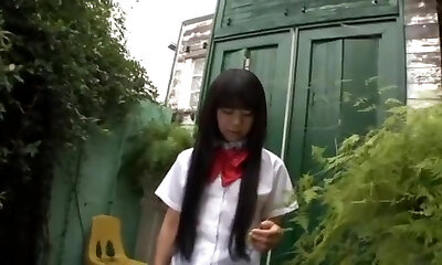 Smooth-shaven pussy of lovely Asian college girl Ami Oya is poked doggy