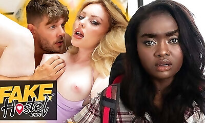 Thre trampy brunettes fellate and fuck nerdy Logan in the bedroom