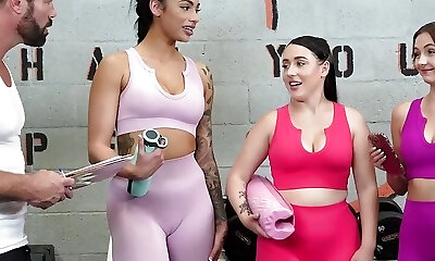 Two Fit Black-haired Babes Fucking Coach In The Gym